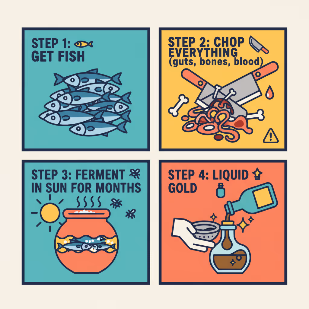 Imagine this: you take a bunch of small fish—sardines, anchovies, mackerel—and you don’t even bother to gut them. You just chop them up, guts, blood, bones, and all, and throw them into a giant vat. Then you layer them with obscene amounts of salt (like, 15% of the total weight) and just… leave it. You let this fish-and-salt slurry sit out in the hot Mediterranean sun to ferment and basically rot for several months. The fish’s own digestive enzymes do the heavy lifting, breaking down the flesh into a liquid. What you’re left with is a brownish, watery sauce that is pure, concentrated umami. And it stank to high heaven.