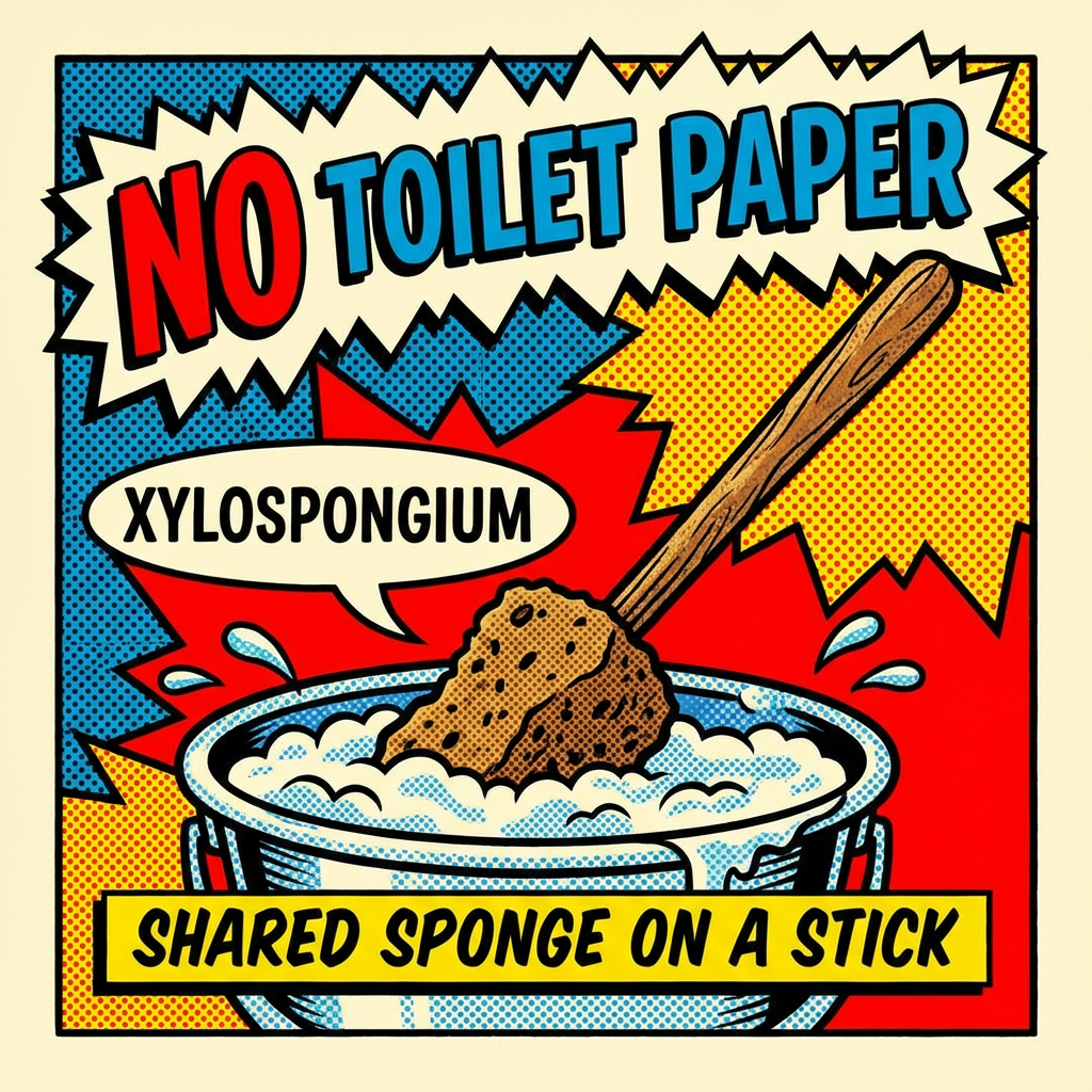 So, no toilet paper. What did they use? A **xylospongium**, or "sponge on a stick." It was a sea sponge attached to a wooden handle. After you were done, you'd rinse it in a channel of constantly running water in the floor and leave it in a bucket of saltwater for the next person. ✨ **Yes, it was communal.** ✨