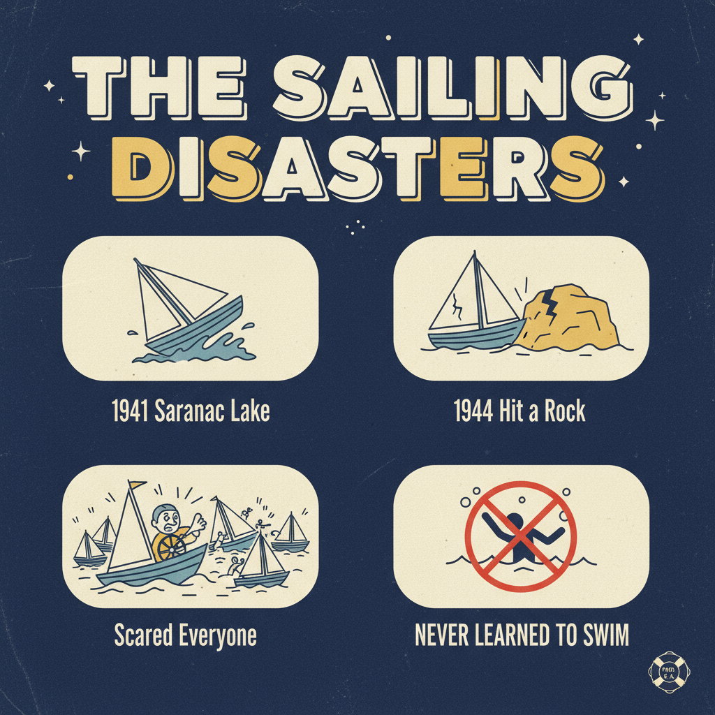 Einstein's sailing career is a comedy of errors. He was known for running aground, getting his mast tangled in bridges, and repeatedly capsizing. In 1944, while sailing on Saranac Lake in the Adirondacks, he hit a rock, capsized his boat, and got tangled in the rigging, having to be rescued by a nearby motorboat. It wasn't his first time—he had capsized on that same lake in 1941. He was a repeat offender.
