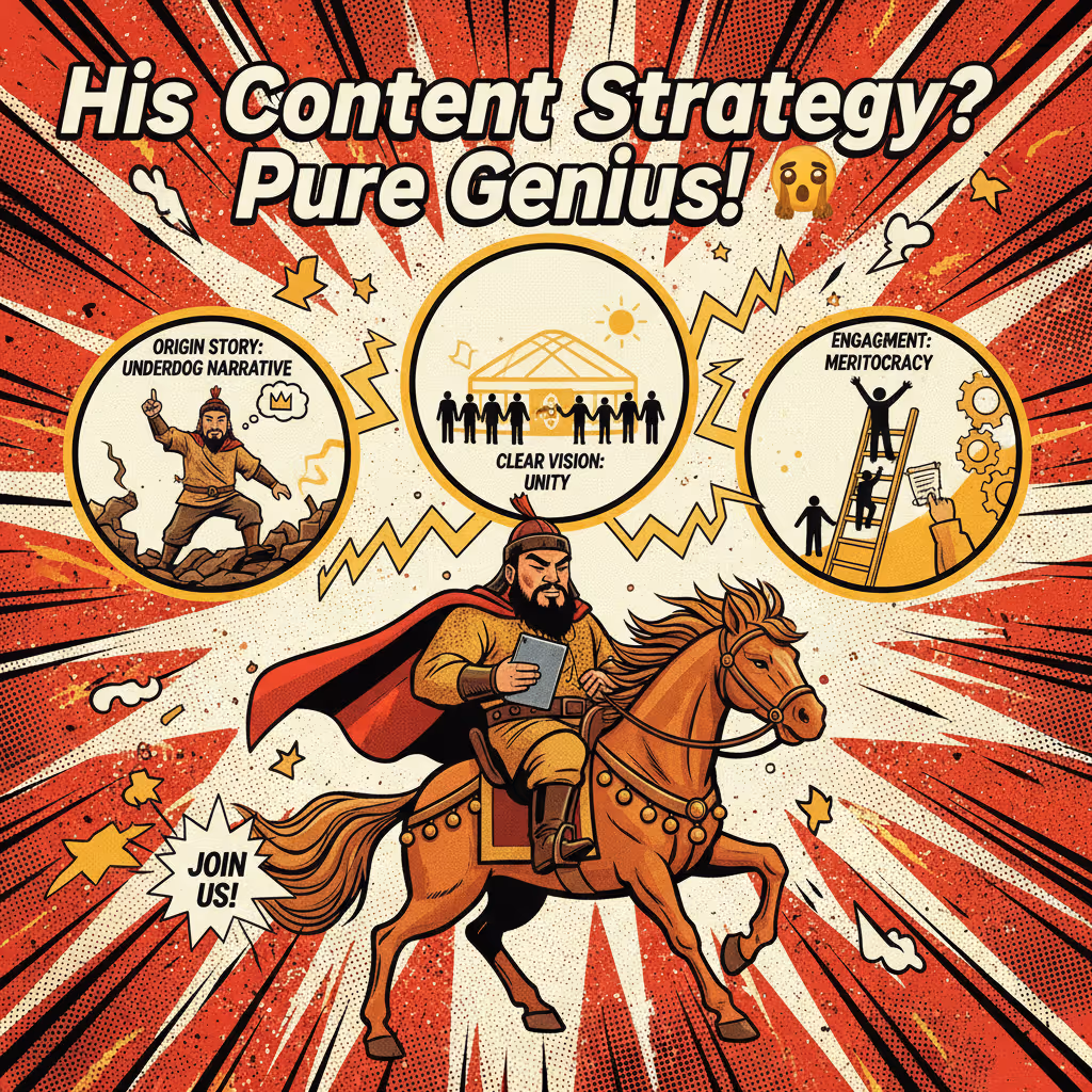 Think about it: what makes an influencer? A compelling story, a clear message, and a loyal community. Genghis Khan had all three: