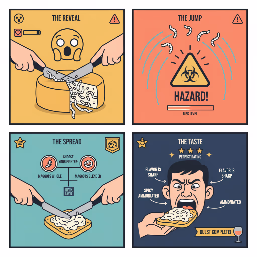 In the world of extreme foods, there are levels. You start with the beginner stuff, maybe some haggis or fried insects. You work your way up through the intermediate challenges, like fermented shark or boiled sheep’s head. And then, when you think you’ve seen it all, you encounter the final boss. A food so legendary, so intense, so viscerally alive that it separates the casuals from the hardcore. Meet Casu Marzu, the traditional Sardinian cheese that is actively infested with thousands of live, jumping maggots.
