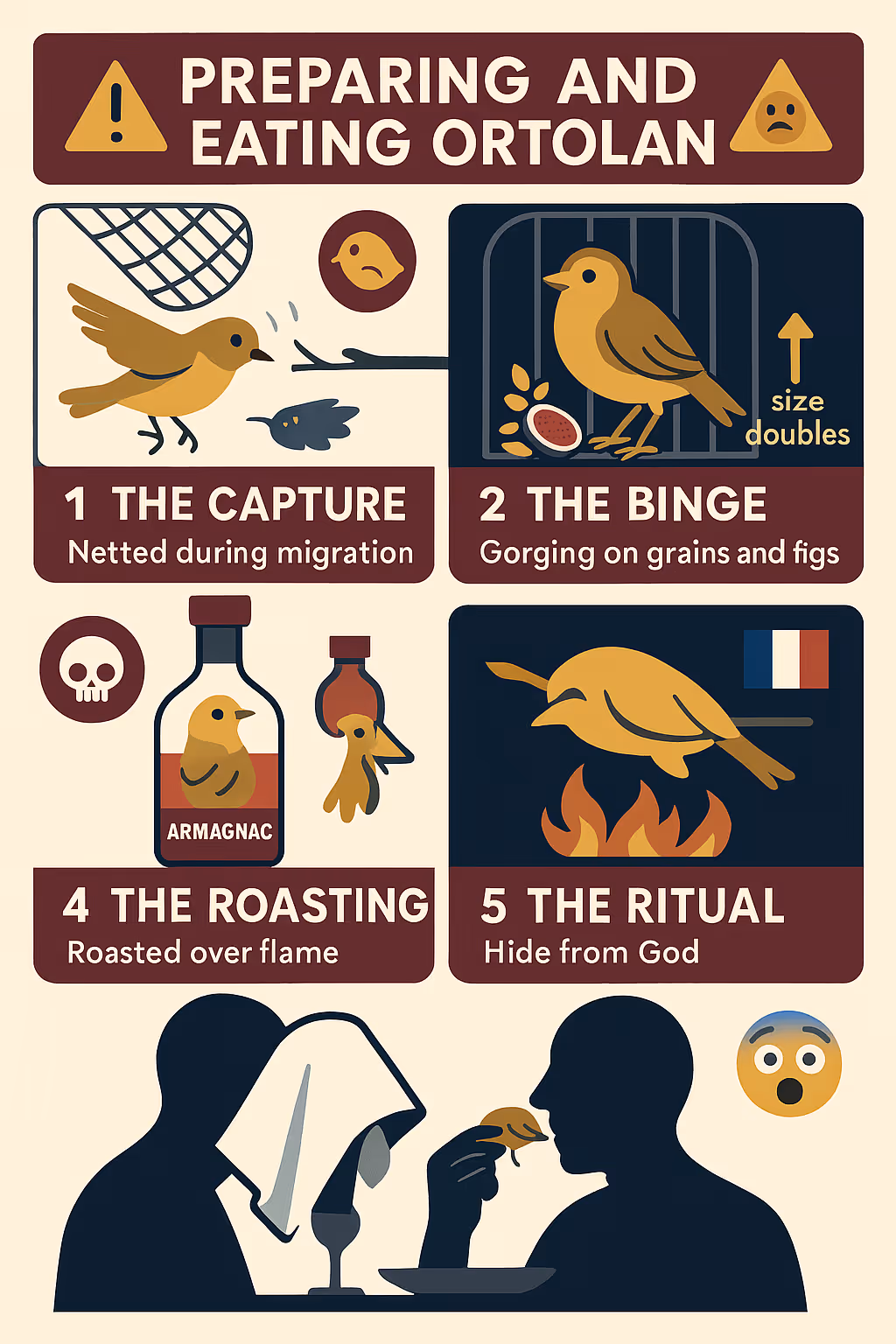 2.Atlas Obscura - "Ortolan Bunting" This provides a fantastic, visceral description of the eating ritual and the cultural significance of the dish, including its association with President Mitterrand’s last meal. https://www.atlasobscura.com/foods/ortolan-bunting-france