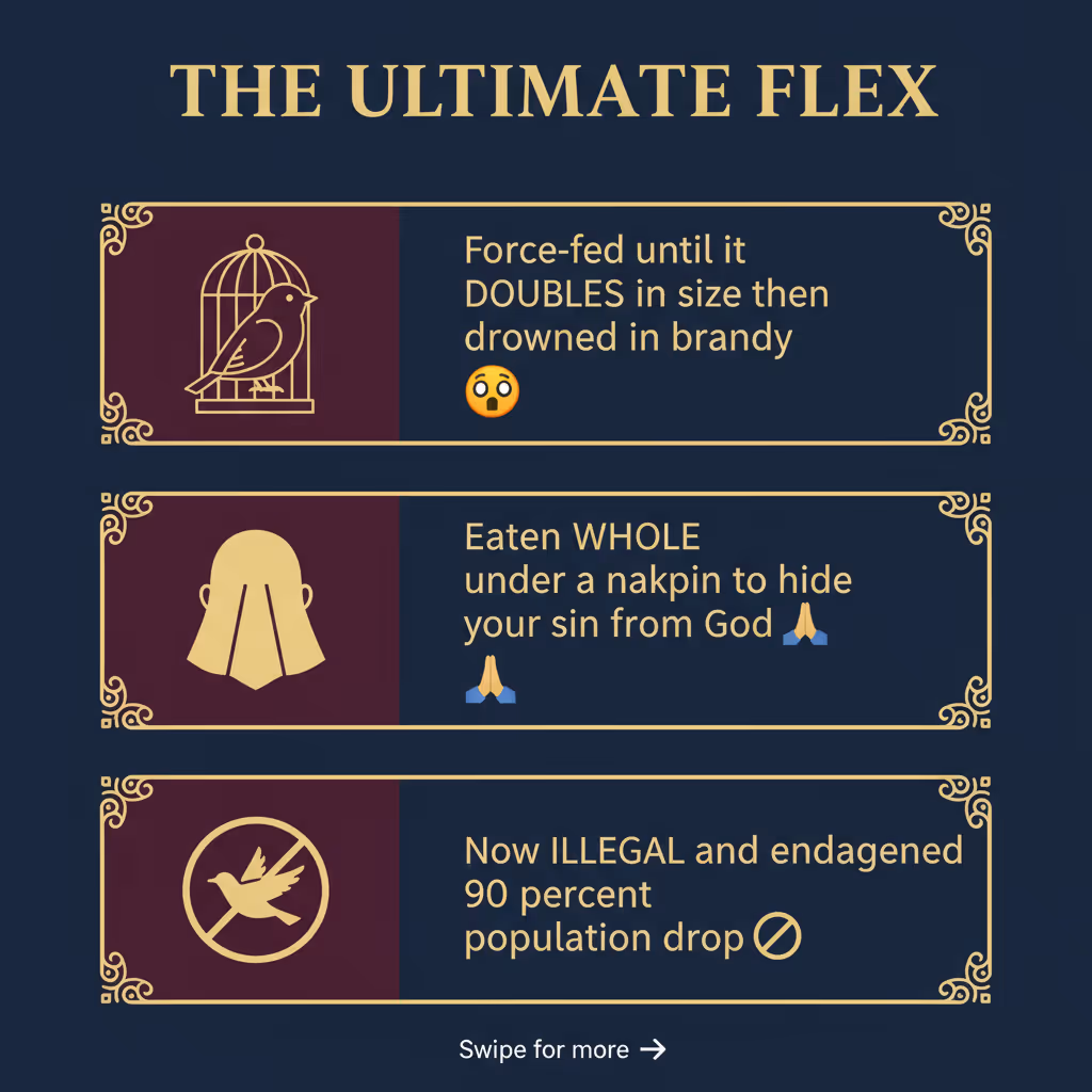 So next time you see a celebrity chef sprinkling salt from a great height, just remember the French aristocracy. They were out here, hiding under napkins, crunching on the bones of endangered songbirds they’d just drowned in brandy. Now that’s extra. 🔥